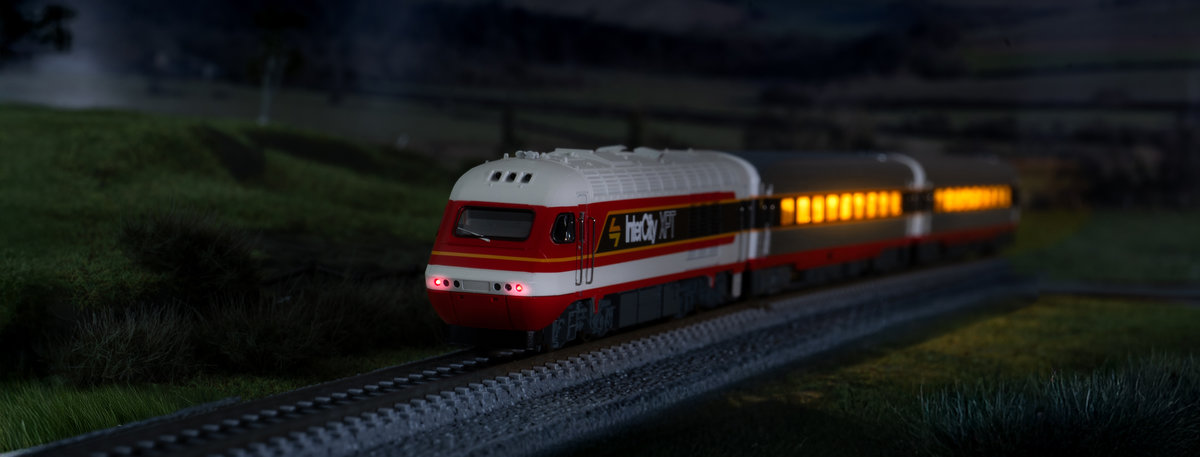 White headlights, red tail lights, and fully illuminated passenger car interiors bring the XPT to life after dark.