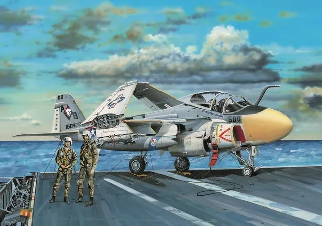 The A-6E is the last production type of the Intruder family.They were developed for the strike missions.A new AN/APQ-148 radar replaced the old version one and the DIANE system were replaced by the lastest computer system.In the late 1970s,the new navigation system called CAINS were equipped,the CAINS A-6E can be distinguished by the extra air scoop on top of the fuselage near the vertical stabilizer.