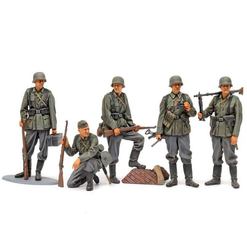 In the middle years of WWII, most German Wehrmacht soldiers were issued with M36 uniform that was field gray with green collar, although some had the M40 with collar also in field gray. The uniform was rounded off with a helmet or cap, jack boots and - in many cases - suspenders for the trousers. Accessories such as pouches, canteen, shovel and more were usually carried, while weaponry depended upon one's rank: enlisted men would have the Kar98k rifle or MG34 machine gun, whereas non-commissioned officers wielded the MP40 submachine gun. Officers and machine gunners would frequently carry a pistol for self-defense.